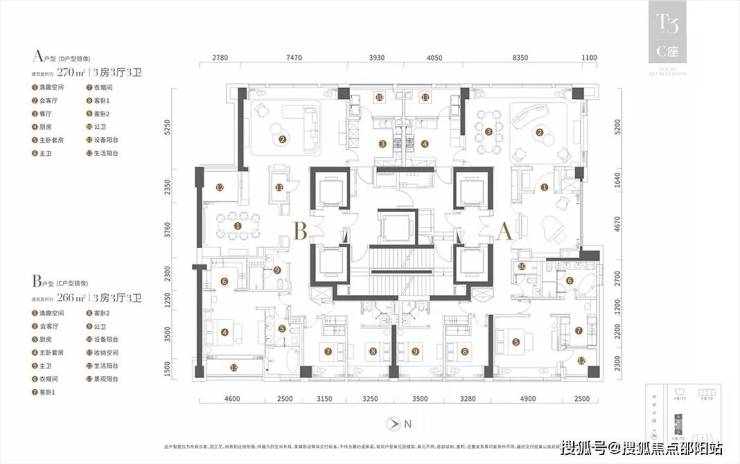 T3栋为266平和270平3房3厅3卫户型。266平主卧套房设计带有衣帽间、卫生间和景观阳台,功能齐全。次卧大小分布均衡。两个户型卧室设计均为同朝向,近40平会客厅,空间阔绰,且拥有优越的景观视野。