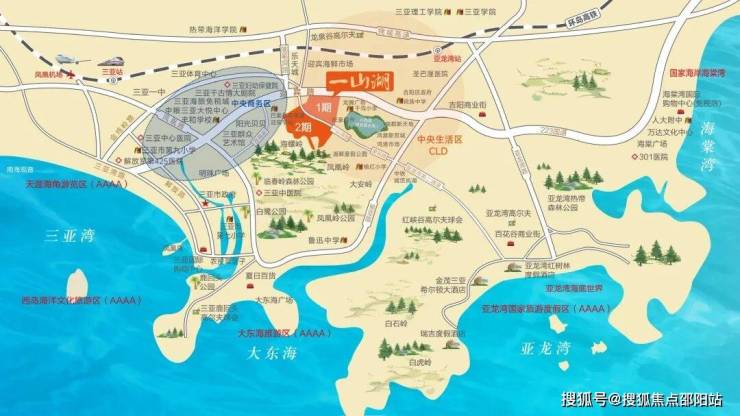 三亚体育中心、三亚市政府、吉阳区政府、三亚群众艺术馆、大东海广场、鹿回头公园、白鹭公园、凤凰岭公园、临春岭森林公园、亚龙湾热带森林公园、海棠广场。
