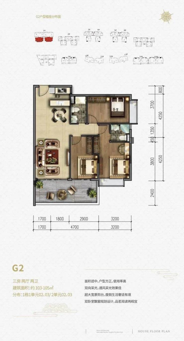 一单元两梯4户,二单元2梯3户,13层高,三房两厅两卫,超大2.4-2.75m阳台开间,双户型全朝南设计。