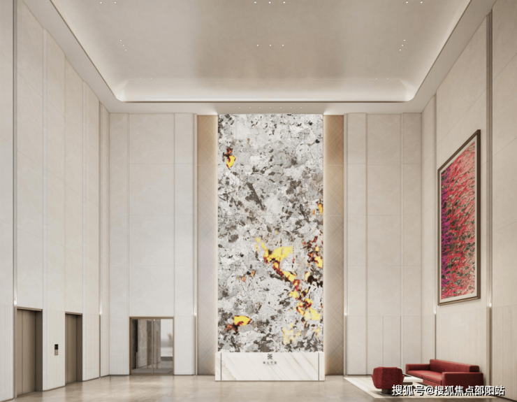 社区主入口的酒店式大堂,是一场材质的和谐对话,石材的温润、通顶玻璃的通透与铝板的利落在此共生。意大利宝格丽奢石接待台的天然脉络,巴西潘多拉透光奢石背景墙的光影流转,与当代艺术牡丹油画形成视觉共鸣;约9米挑高的弧顶艺术涂料天花,为这场美学盛宴加冕。