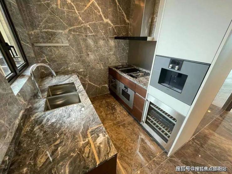 厨房以深色云石铺砌,两旁亦有工作枱,配以白色厨柜,颜色配搭突出,并设16平方呎工作平台。