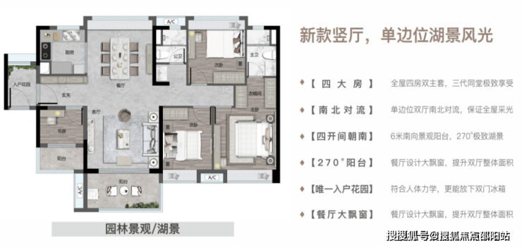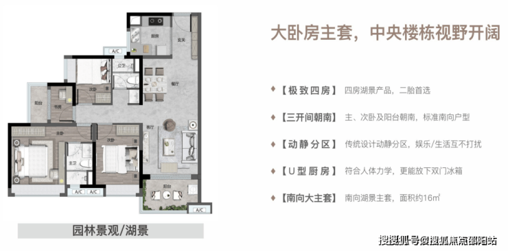 140平方米四房二厅二卫:四房双主套,6米大阳台,望湖极致景观面。