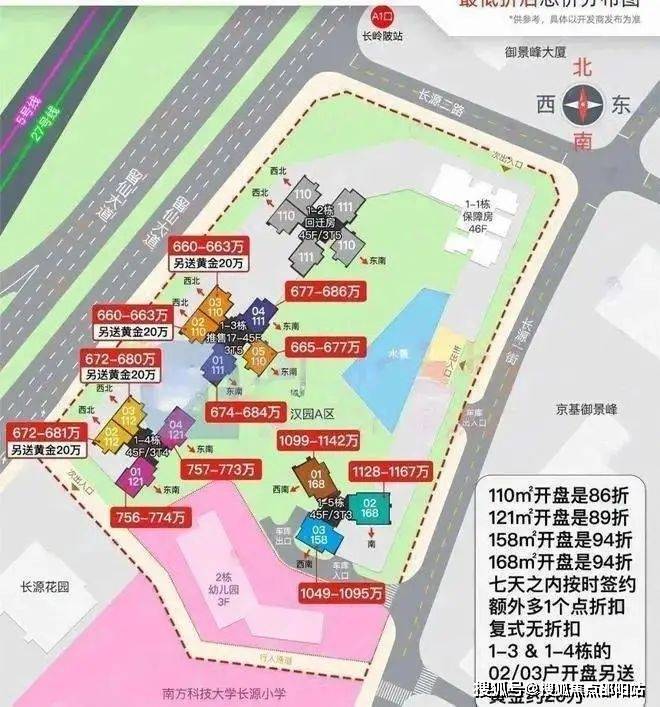 3.;深圳北站总部基地 ——即是交通枢纽也是产业基地,目前在开发的华润万象城也能为该区位提供生活便利,除了上面这些,西丽高铁枢纽也在建中,汇集4高铁2;城际(深惠、深莞)4地铁(在建13号线、规划15/27/29号线),但目前高铁推进缓慢,前不久传出消息要重做环评,这也拖累了13号线的竣工计划,预计通车还要延后一两年,总的来看项目片区规划规格很高,周边都是高新技术产业和科教文化产业,高净值人群集中,未来发展潜力很大。产品概述;项目分为A\B区,本次推出的A区离地铁站出入口更近,也更靠近高架地铁线,但据地图测量间隔有近100米,地铁噪音对住宅的影响不会特别大。A区主要由5栋住宅组成,二、三、四单元45层,一、五单元46层,其中一单元为保障房,不与其他商品房混在一栋楼里,朝向大都是西南/东南向,少数腿正南向,三单元15楼以上及四、五单元为本次推售楼栋,面积109~169㎡的三-四房,另有12套顶楼复式。A区南面是9班幼儿园,整个小区花园中规中矩,楼栋布局比较齐整,对视情况不严重,不过间距略有些近了,看着有点挤