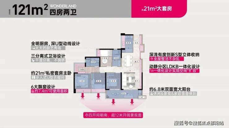 建面约121平四房,拥有约6.8米双面宽大阳台,打造21平套房主卧,四开间朝南,超过约12米园林景观面,在客餐厅公共区域,可打造约13.65米长的一体式收纳空间(玄关柜+餐边柜+电视柜+家政柜),是改善人群的置业优选。
