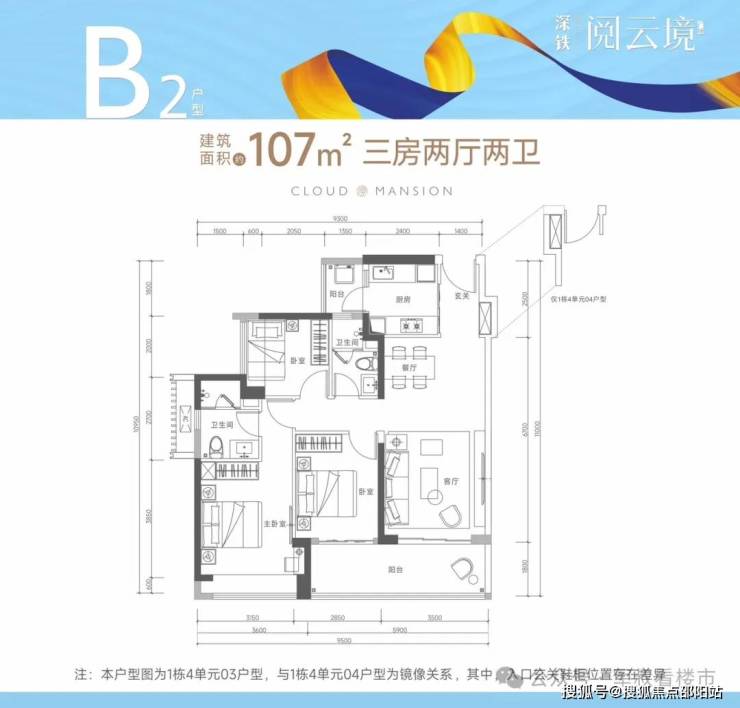 约107㎡的3房2厅2卫(B2户型,1栋4单元03/04户型)设计的是经典竖厅格局,进门独立玄关,客厅3.5米开间,LDKB一体化设计,动静分区,3个卧室分别做到了主卧15.5㎡/次卧9.26㎡/次卧6.36㎡(包含墙体飘窗),客厅连接次卧出6.35米长的大阳台,二字型厨房还带1个生活阳台。