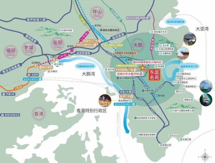 项目位处深圳东南部大鹏半岛中心区,东临大亚湾,与惠州接壤,西抱大鹏湾,遥望香港新界,属粤港澳大湾区城市群重要节点,距离市区约 45分钟车程。