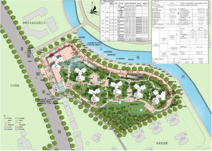地块北面临王母河,南面为布新统建楼层高11 层,西面为葵南路,南面和西面,视野开阔,无遮挡,为最大化南向采光及景观视野,6栋楼栋以蝶形点式排列。