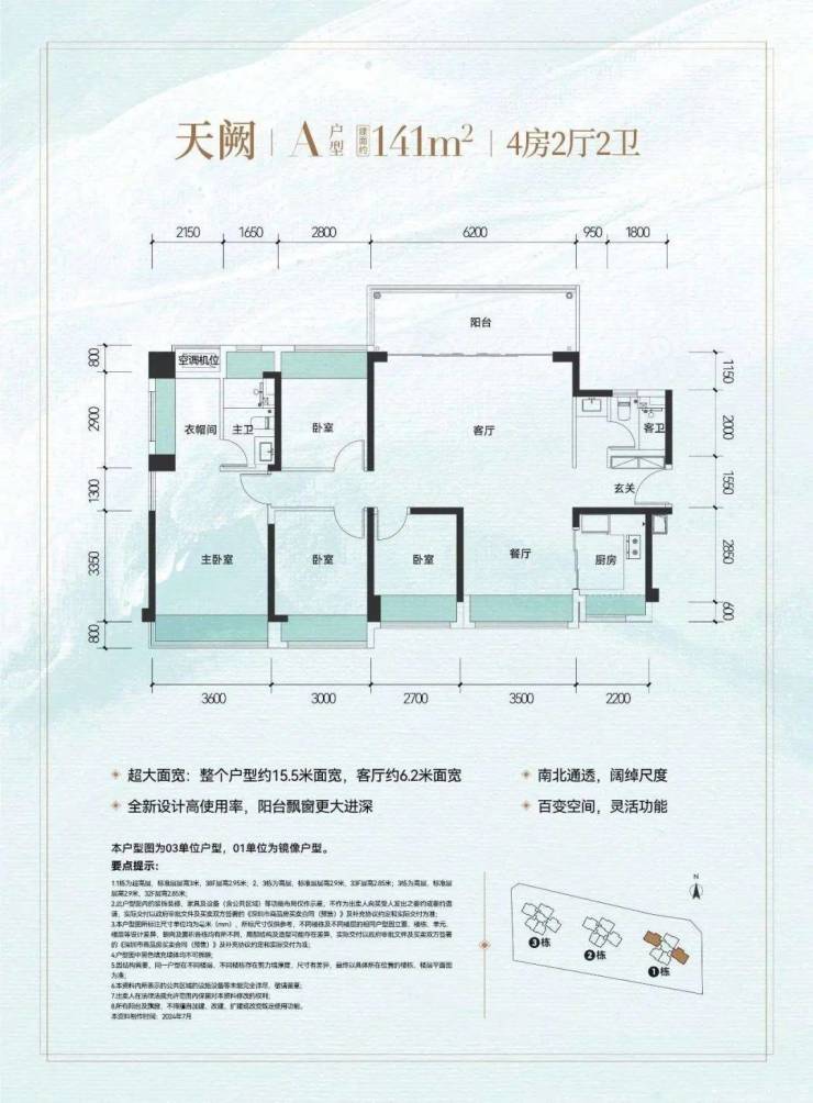 141㎡的4房2厅2卫,设计的是横厅南北通透格局,进门入户玄关,超宽客厅6.2米的开间,五开间朝南,4个卧室分别做到了3.6米/3米/2.8米/2.7米的宽度,主卧大套房设计,U型厨房,公卫三段式分离设计,得房率约:81.4%(不含赠送),阳台主朝东北向,看科学公园景观。