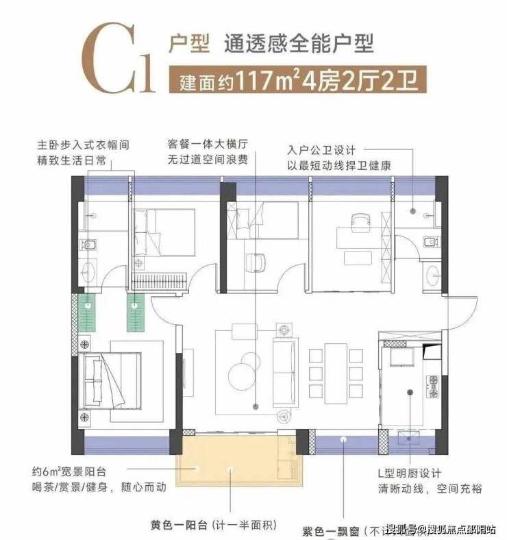 建面约117㎡横厅4房2厅2卫,与116㎡同个面积在横厅设计,自然是可以满足南北通透的需求。