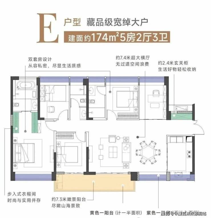 建面约174㎡横厅5房2厅3卫,做到五开间朝南向,夏天享清风,冬日晒暖阳。7.3米超长阳台,搭配约7.4米超大横厅,会客休闲气度十足,观景远眺一览无余。奢侈双主卧套间设计,保障熟人私密性,尊重并平衡两代的生活习性。