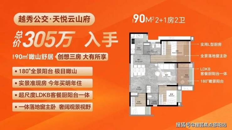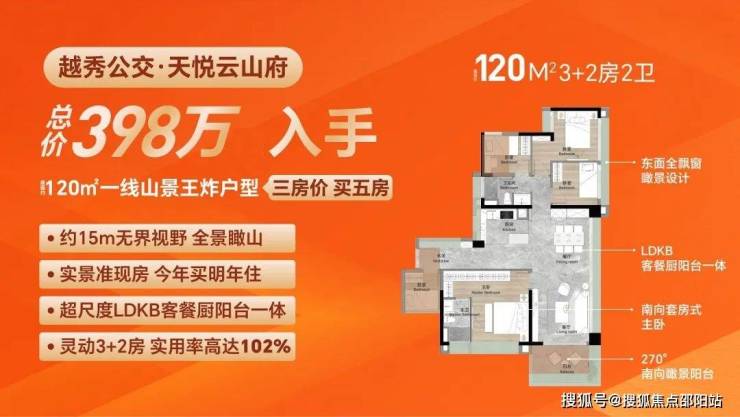 特点:双面宽瞰景阳台,三卧室南向瞰山,LDKB客餐厨阳台一体。