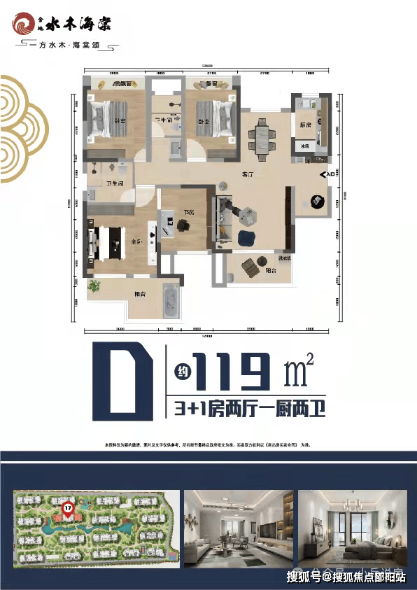 建筑面积约119㎡;3+1室 2厅 1厨 2卫 大阳台 入户泡池纯板式 一梯两户 南北通透 精装拎包入住