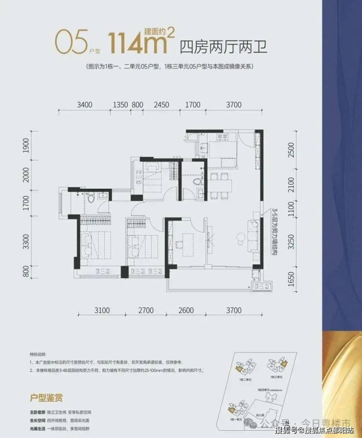 114㎡的4房2厅2卫,设计的竖厅格局,客厅3.7米开间,四开间朝南,4个卧室分别是3.1米/2.7米/2.6米/2.45米的宽度,客厅连接卧室带6.3米长大阳台,U型厨房,房,得房率:77.74%(不含赠送),有西南或东南朝向。