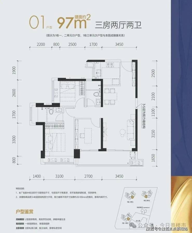 97㎡的3房2厅2卫,设计的竖厅格局,客厅3.45米开间,三开间朝南,3个卧室做到了3.1米/2.7米/2.5米的宽度,客厅连接卧室带6.15米长大阳台,U型厨房,得房率:77.73%(不含赠送),有东南向或西南朝向。