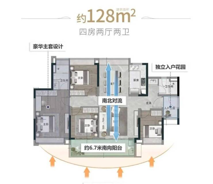 建面约128㎡四房,四开间朝南+南北通透,加上约6.7米南向阔绰阳台,采光观景,不在话下。