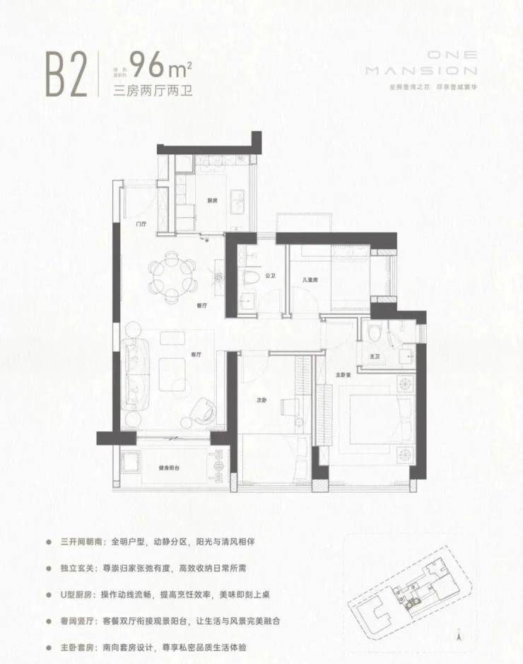 设计的经典竖厅格局,客厅3.6米开间,餐客厅一体化设计,三开间朝南,3个卧室分别做到了3.3米/2.9米/2.7米的宽度,L型厨房,得房率72.47%(不含赠送),东南朝向。