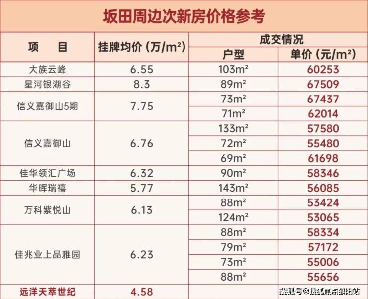 坂田目前次新房的价格挂牌价基本在6-7万/㎡区间,成交价5-6万/㎡,比远洋天萃相比高8000+元/㎡(用次新房最低成交单价53065元/㎡计算)的价差。