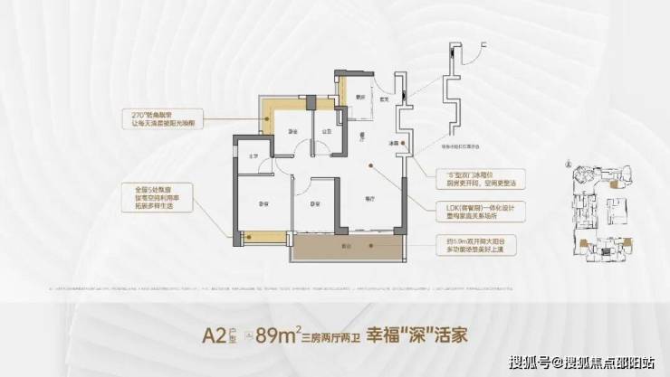 客厅3.5米开间,LDK一体化,客厅连接次卧出5.9米双开间大阳台,次卧270°转角飘窗。