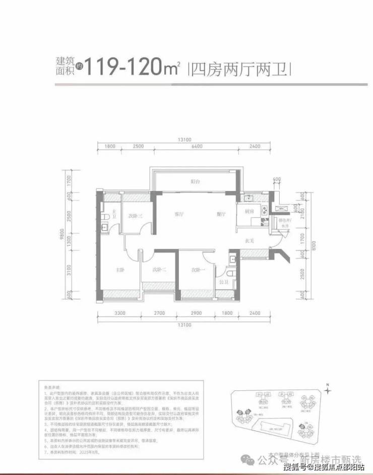 120㎡的4房2厅2卫,设计的横厅南北通透格局,客餐厅6.4米宽,进门独立玄关,4个卧室分别做到了3.3米/2.9米/2.7米/2.5米的宽度,U型厨房,公卫三段式分离设计,得房率:74.47%(不含赠送),带大阳台进深1.7米,长6.2米,主朝西北或东北向,看科学公园景观。