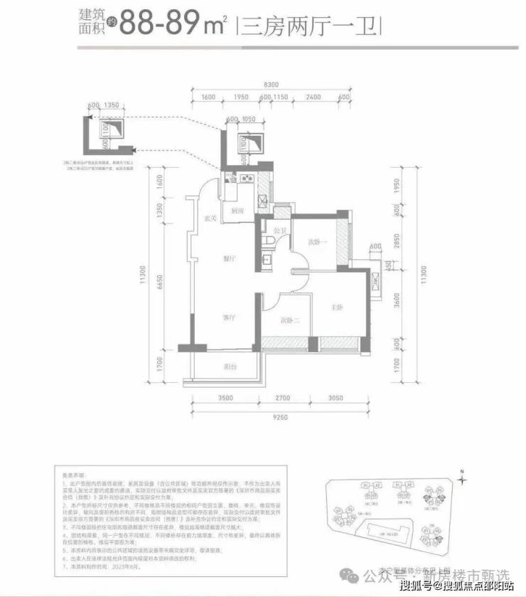 89㎡的3房2厅1卫,设计的竖厅格局,客厅3.5米开间,LDKB一体化设计,S墙设计预留冰箱位,3个卧室分别做到了3.05米/2.85米/2.7米的宽度,U型厨房,得房率:73.87%(不含赠送),阳台进深1.7米,有西南或东南朝向。