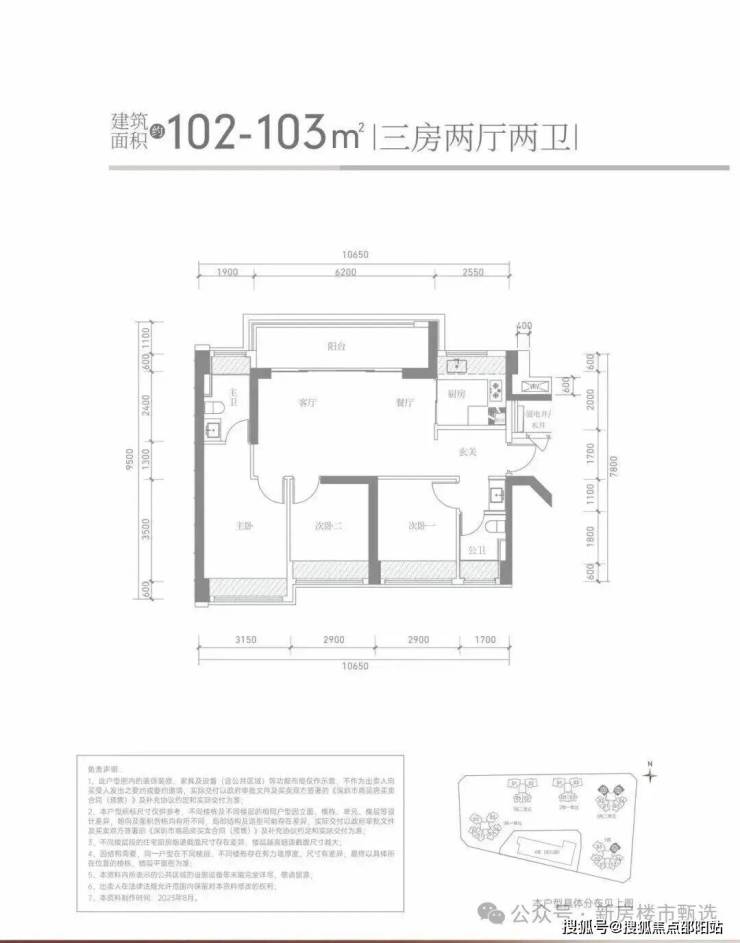 102㎡的3房2厅2卫,设计的横厅南北通透格局,客餐厅6.2米宽,进门独立玄关,3个卧室分别做到了3.15米/2.9米/2.9米的宽度,U型厨房,公卫三段式分离设计,得房率:73.88%(不含赠送),带大阳台进深1.7米,长6.2米,主朝西北或东北向,看科学公园景观。