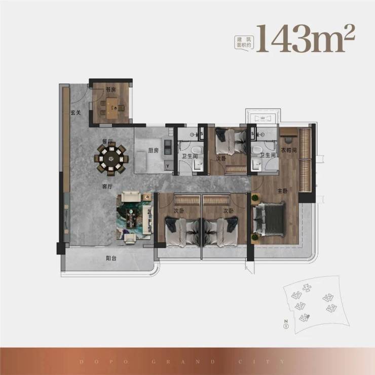 143㎡户型,南向宽景4开间设计 ,约36.5M环幕采光面 |,270°环幕瞰景主卧,多元化功能阳台。