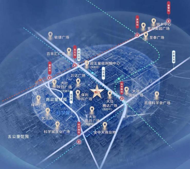项目规模达 400 万方,其中商业配套占 200 万方。周边环绕万达广场、大壮国际广场、揽月广场(在建中)、映日广场(在建中)、腾达广场(规划中)五大广场,项目旁拟规划建造五星级购物中心(以实际建设为准),繁华生活在此开启。