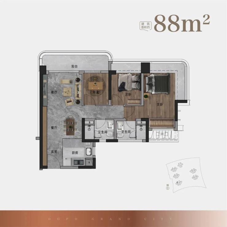 88㎡户型,约5.7M巨幕阳台 , 270°环幕瞰景主卧,LDKB一体化设计
