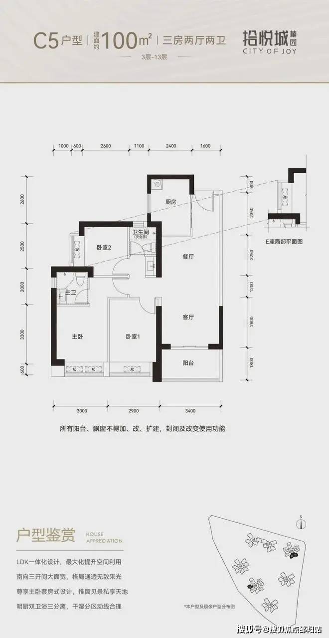 100平三房:设计的是竖厅格局,进门入户玄关,客厅3.4米开间,LDKB一体化设计,3个卧室分别做到了3米/2.9米/2.5米的宽度,U型厨房,公卫三段式分离,得房率:77.14%(不含赠送),阳台1.8米宽度,西南或东南朝向。