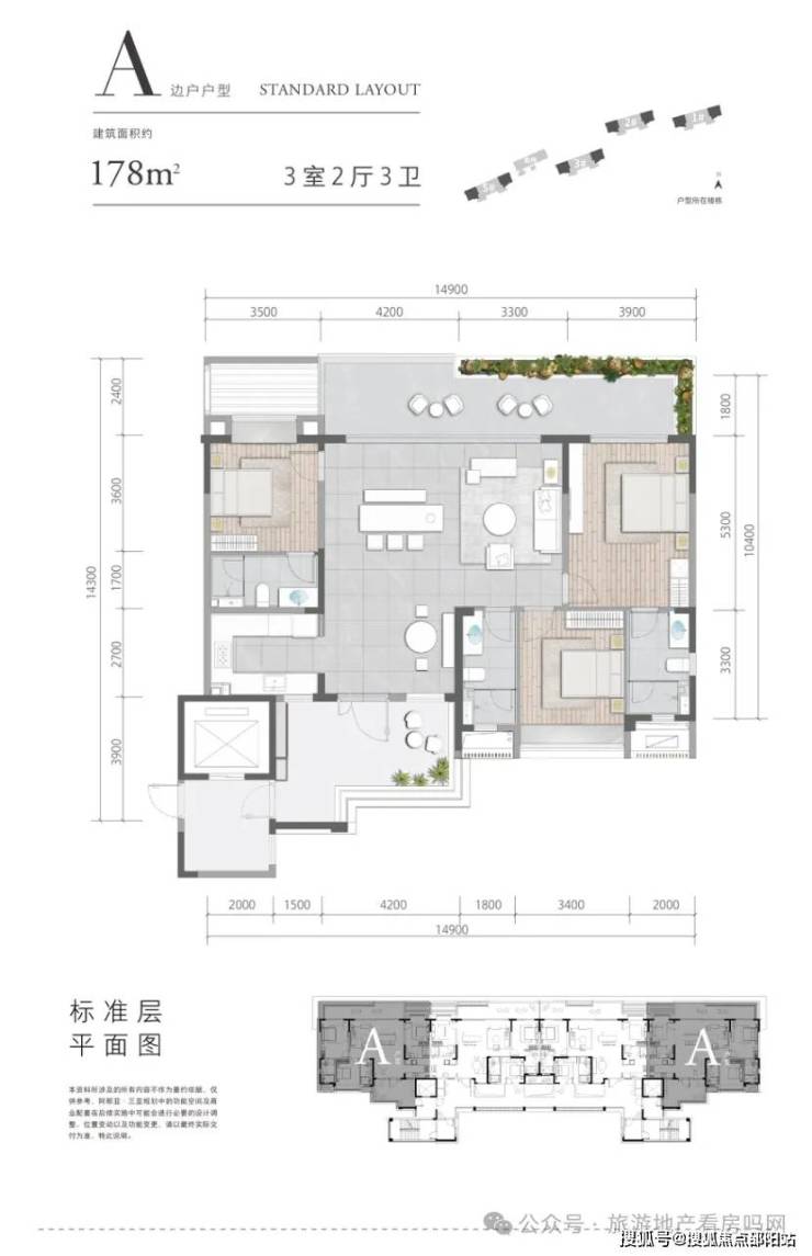 果岭景观大平层:A户型,建筑面积约178㎡,3室2厅3卫。该户型面向果岭,瞰景大平层,入户即享小花园;客餐一体,连接超宽阳台;南向主卧,带独立卫生间。
