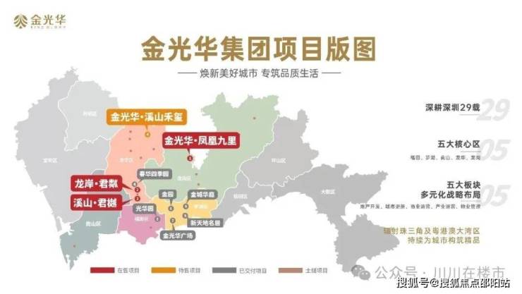 金光华集团深耕罗湖、福田、龙华、龙岗、南山5大核心城区,不断地探索人居生活的艺术,自1995年成立以来,凭借领先于时代的远见及多年来对深圳城市进程的深刻理解,金光华开发了一系列业内领先的标杆性项目。