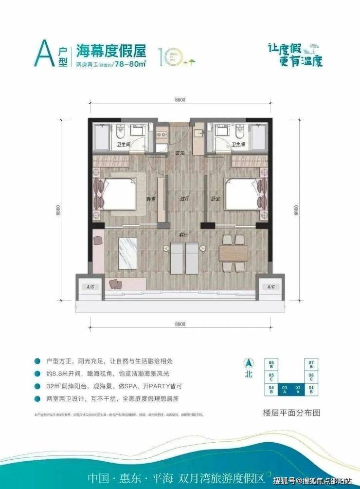 户型方面,单房、双套房的设计,面积不大,却是有更多的活动想象空间,单是180度一线无遮挡观海,就能让你醉晕在双月湾这一片汪洋大海中。