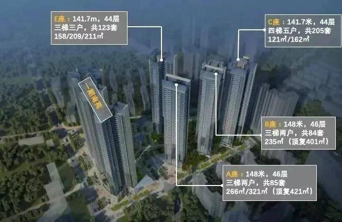 1栋E座:141.7米,44层 共123户,朝南为主,三梯三户