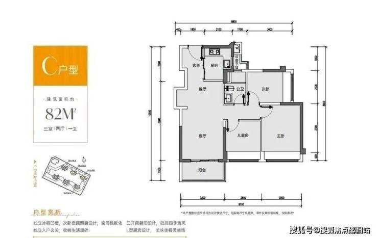 82㎡的3房2厅1卫,设计的是竖厅格局,客厅3.3米开间,S墙体设计预留双开门冰箱位,动静分区,三开间朝南,3个卧室宽度分别为3/2.8/2.5米,得房率:88.87-90.61%(包含赠送),L型厨房,阳台进深1.5米,朝西南或东南向。