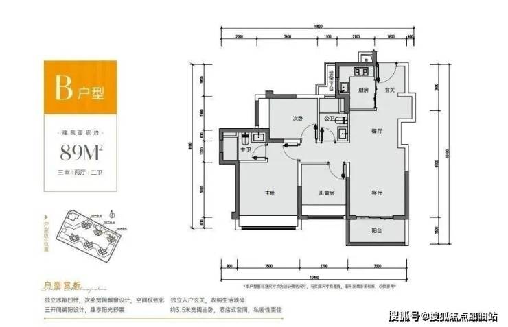 89㎡的3房2厅2卫,设计的是竖厅格局,客厅3.3米开间,S墙体设计预留双开门冰箱位,动静分区,三开间朝南,L型厨房,3个卧室的宽度分别为3.5/2.7/2.5米,得房率87.96-89.68%(包含赠送),阳台进深1.5米,朝西南或东南向。