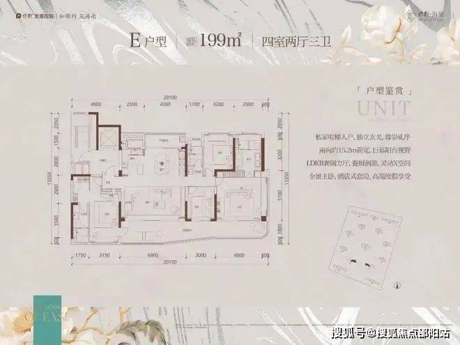 【酒店配套】22公里海岸线,汇集亚特兰蒂斯酒店、红树林、艾迪逊、保利瑰丽酒店等32家(已开业约 23家) 知名国际品牌酒店建筑设计】点式布局,中心楼王设计,形成超大中心景观花园组团,保证良好景观视野。东面40米以上看海,西面山景景观。