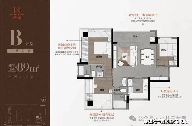 89㎡的3房2厅2卫,B户型(1栋1单元07户型),设计的是横厅南北通透格局,进门入户玄关,客餐厅5.2米开间,LDKB一体化,S墙设计预留冰箱卡槽位,三开间朝南,主卧+1个次卧双面大飘窗,客餐厅出5.2米宽景阳台,U型厨房,公卫三段式分离,得房率76.77%(不含赠送),套内面积68.95㎡,阳台主朝西北向。