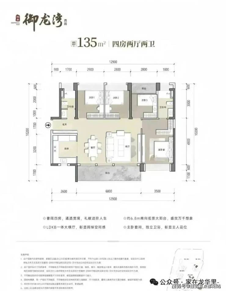 135㎡4房2卫,设计的是横厅南北通透格局,客餐厅开间6.8米,LDKB一体化设计,四开间朝南,U型厨房,公卫三段式分离设计,得房率约79.25%(不含赠送),阳台主朝东南或西南向,加上赠送得房率约90%