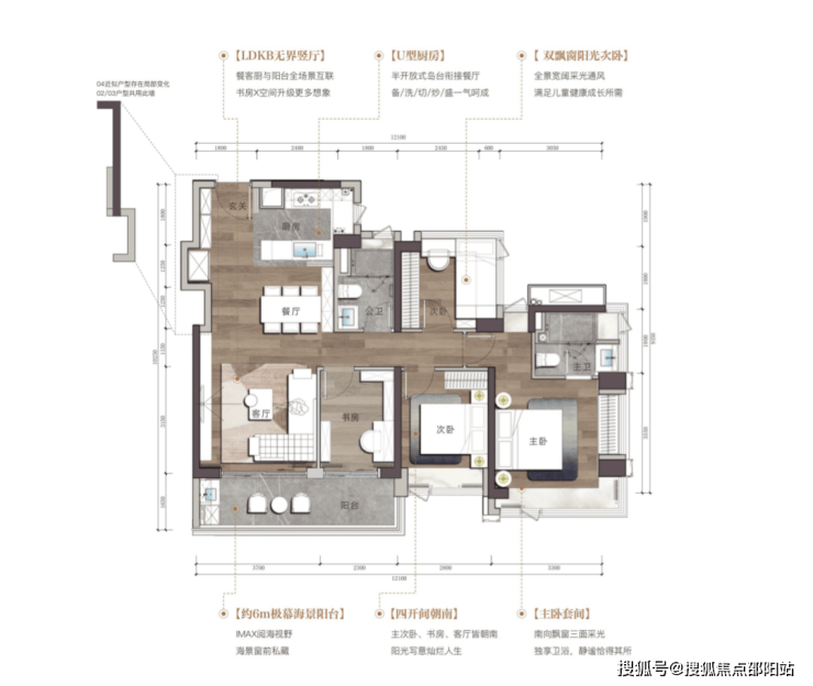 该户型做了四房两厅两卫,整体格局方正,U型厨房,LDKB无界竖厅设计,四开间朝南。其中,南向的阳台带270度环幕视野,连接客厅和书房,长达约6米;主卧带双面飘窗,往外望就是前海湾璀璨繁华滨海景象。