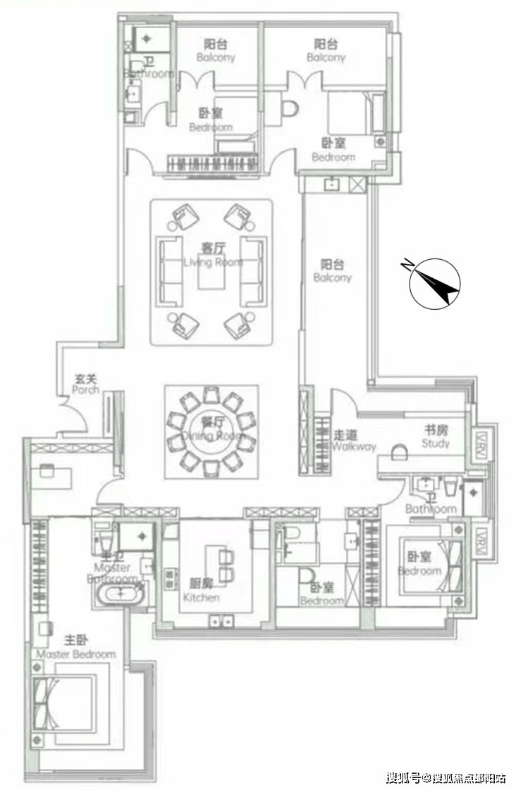 高区03户型,219-221㎡,朝西南,五房三卫: