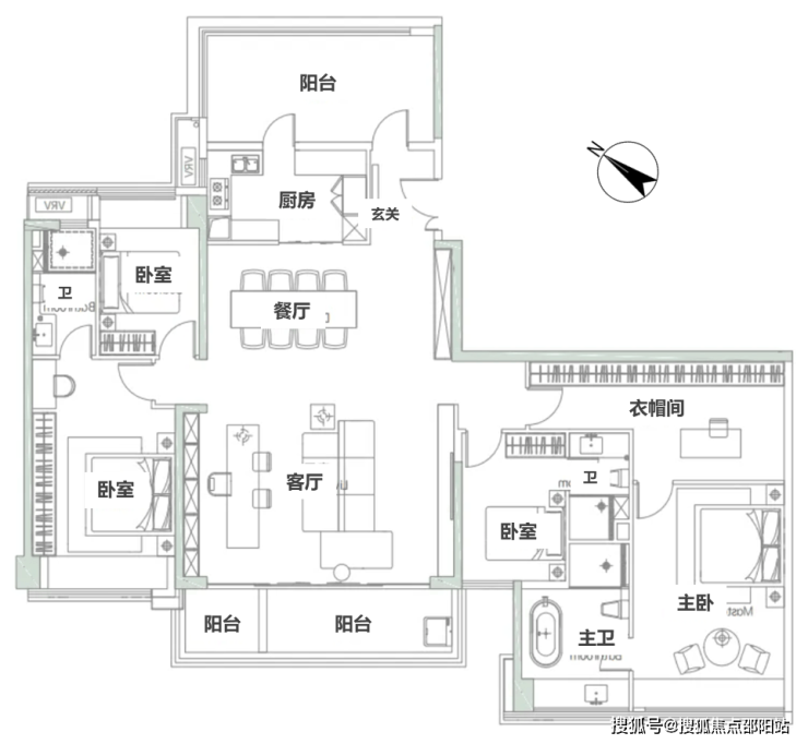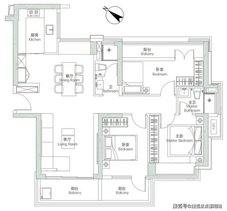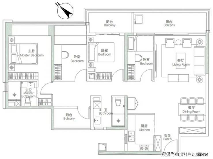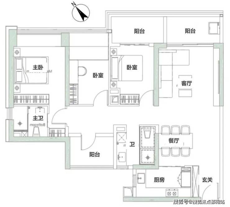 低区03户型,122-124㎡,常规三房两卫格局,三开间朝西南,一卧室朝东南,三阳台是亮点: