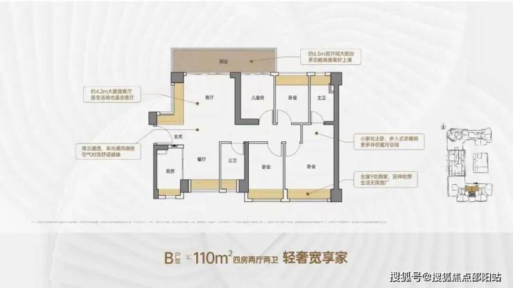 110㎡的4房2厅2卫,设计的是竖厅南北通透格局,客厅4.2米开间,进门户玄关,客厅连接次卧出6.5米长的大阳台,主卧大套间设计,全屋9处飘窗,U型厨房,卫生间干湿分离,阳台主朝北向。