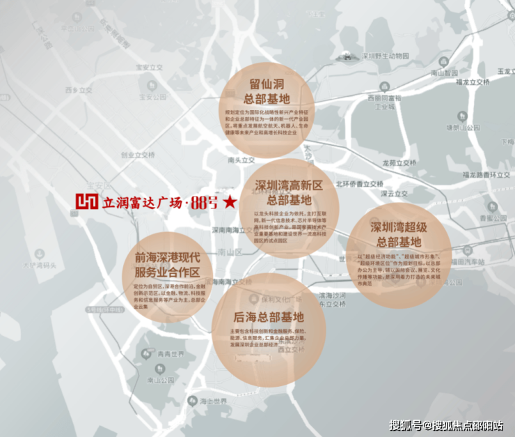 中国科创看深圳,深圳科创看南山,深圳市6+1总部基地,南山区独占4+1,项目毗邻深圳湾高新区总部基地,前海合作区,后海、深圳湾、留仙洞总部基地环绕,战略高地围合,智领深圳价值中芯