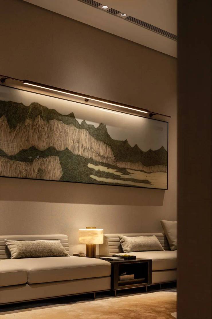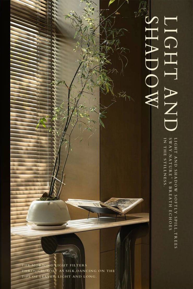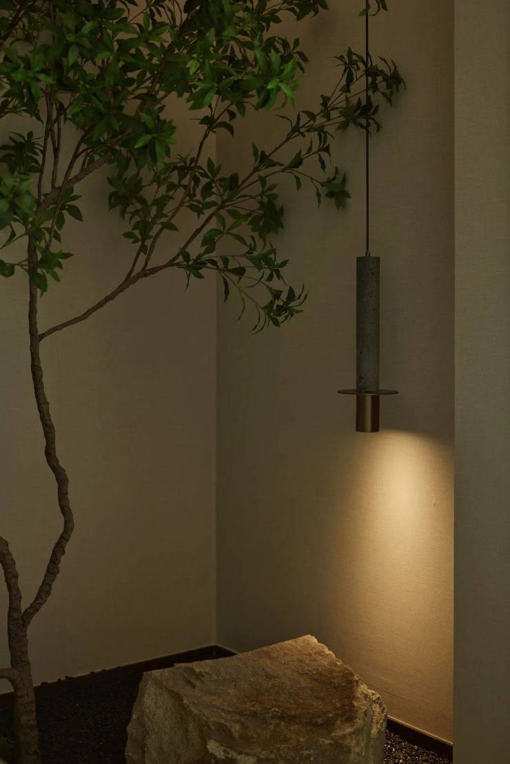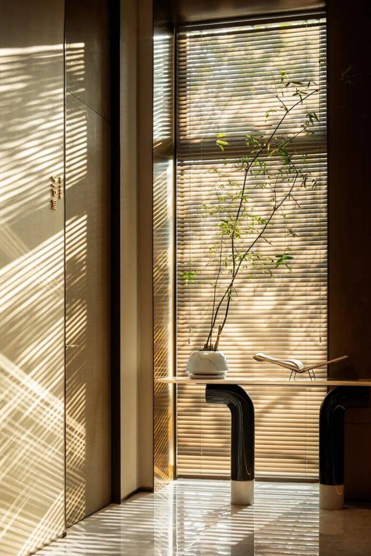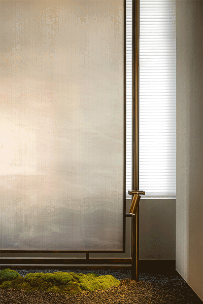 作为与室外景观的对话,设计师植根于生活诗性美学的践行,将大自然的灵趣渗透在室内景观连廊。自然感的木石与屏风的留白呼应,空间氛围在开放与宁谧之间自然过渡。