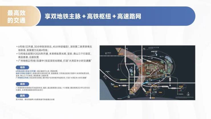 项目靠近地铁6号线【光明大街】站(已开通)直达福田,地铁13号线(在建)连接光明与深圳湾口岸。龙大高速、南光高速两大免费高速可快速通达全城。广深港高铁光明城站往返深圳北、福田便捷,赣深高铁及未来的莞深城际也在此交汇。