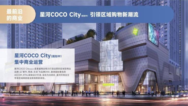 星河天地大社区规划引进的星河COCO City,是星盛商业运营的区域型商业品牌,以“都市、格调、生活”为品牌DNA,邀请国际著名的AECOM、RTKL联袂设计打造。高端休闲业态覆盖,一站式满足饮食、商务、娱乐、趣玩等需求。
