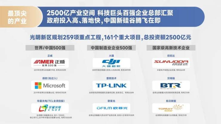 据2022年1月27日深圳市光明区人民政府印发的《光明区战略性新兴产业发展“十四五”规划》,力争至2025年打造3-5个百亿级平台引领型企业生态圈,百亿级龙头企业达7家、年产值超10亿元的企业超50家、上市企业数量超30家、省市级“专精特新”中小企业达100家、专精特新“小巨人”企业达18家、制造业单项冠军企业(产品)达7家。未来将集聚更多高精尖人才,高阶客群不愁租。