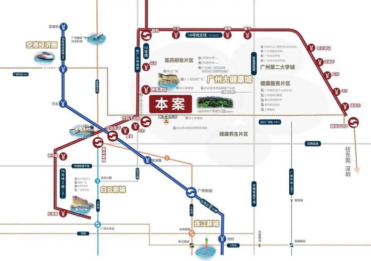 旭辉·绿地·铂云天境位于地铁14号线钟落潭站附近,因此通过地铁可无缝对接城区各大板块乃至湾区各城市群,比如1站至竹料站,换乘新白广城轨1站至白云机场。