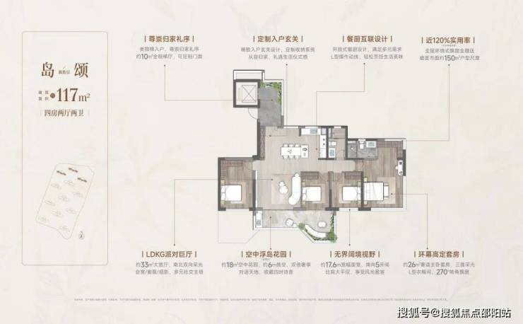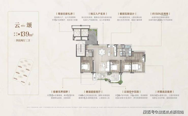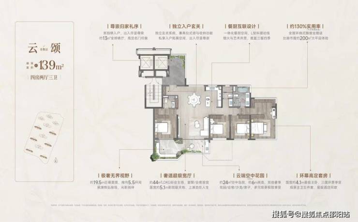 四代洋房·奢享写意人生 | 双入户大堂、一梯一户,稀缺至高约130%实用率(不含电梯厅),6面朝南,270°环幕采光,定制约6m错层空中浮岛,奢享墅质生活