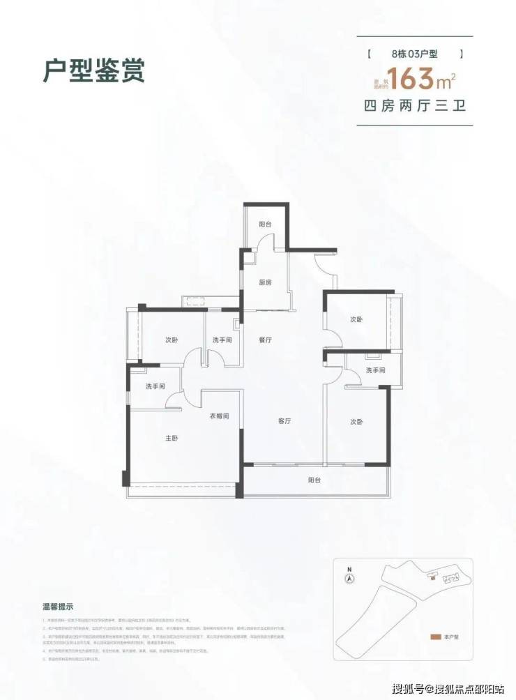 163㎡的4房2厅3卫,设计的是竖厅格局,一梯一户,进门入户玄关,LDKB一体化设计,三开间朝南,双主卧套房,客厅连接次卧出大阳台,L型厨房还带1个生活阳台,卫生间干湿分离,得房率约82%(不含赠送),东南朝向。